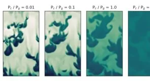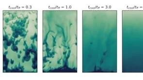 The first movie (top) shows thermal instability without cosmic rays. The columns are organized by the efficiency of cooling in the simulations from highest (left) to lowest (right). When cooling is efficient, the simulation forms many cold gas cloudlets that precipitate. When cooling is inefficient, no cold gas forms.