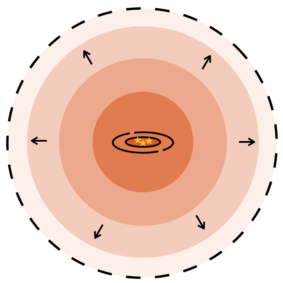 Figure 1: A (simplified) schematic of cosmic rays in the CGM. Galactic supernovae inject roughly 10% of their energy as cosmic-ray energy. Those cosmic rays move away from their injection site along tangled magnetic fields, creating a cosmic-ray pressure gradient that helps maintain hydrostatic equilibrium. This cosmic-ray pressure may be a significant, or even the dominant pressure source in the CGM around L* galaxies, however, the quantitative details (e.g., the exact cosmic-ray pressure or its radial extent) are sensitive to models of cosmic-ray transport, which remain unconstrained.